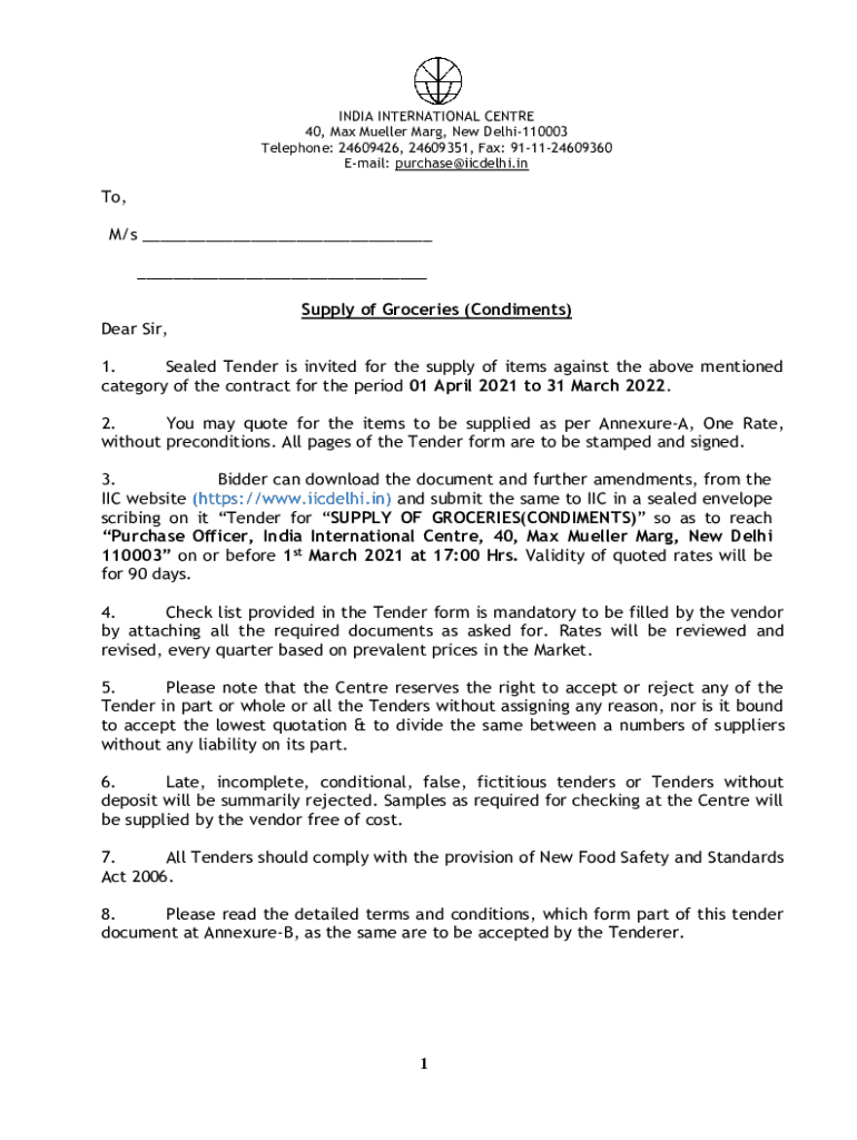 INDIA INTERNATIONAL Center 40, Max Mueller Mary, New Delhi110003 Telephone: 24609426, 24609351, Fax: 911124609360 Email: purchase@iicdelhi.inTo, M/s ___ ___ Supply of Groceries (Condiments) Dear Sir,