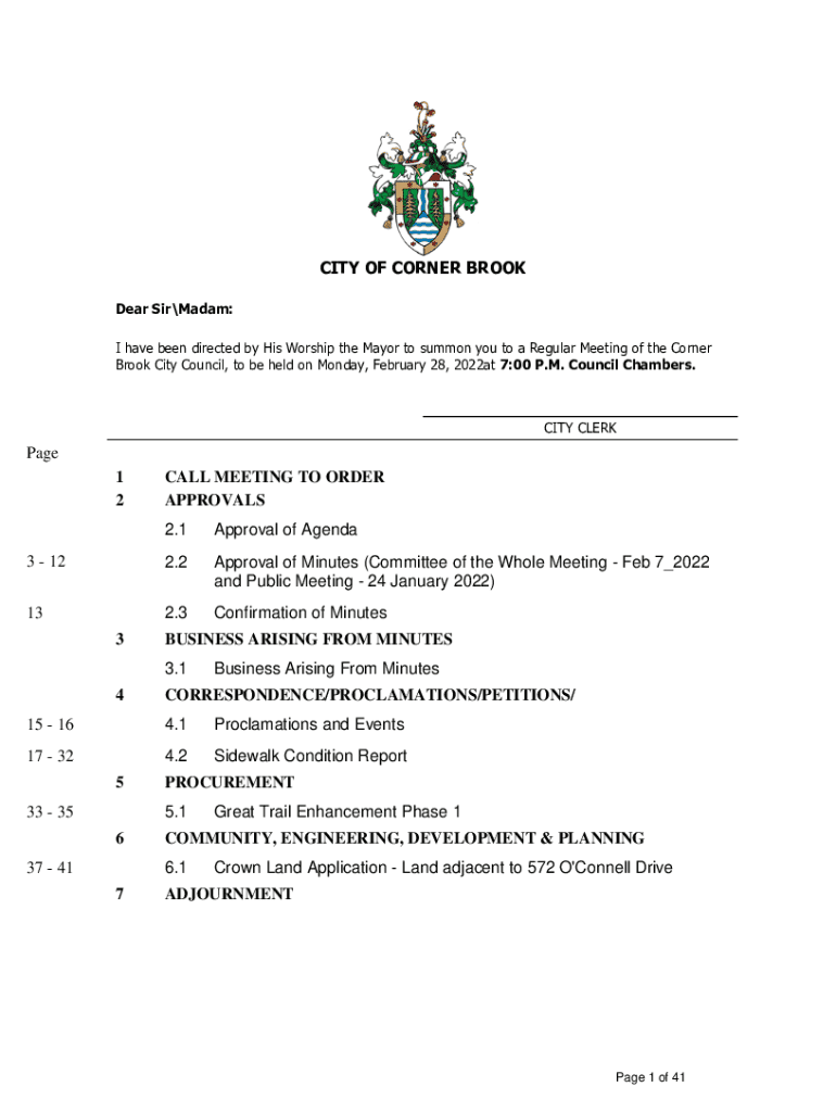 CITY OF CORNER BROOK Dear Sir Madam: I have been directed by His Worship the Mayor to summon you to a Regular Meeting of the Corner Brook City Council, to be held on Monday, February 28, 2022at 7:00
