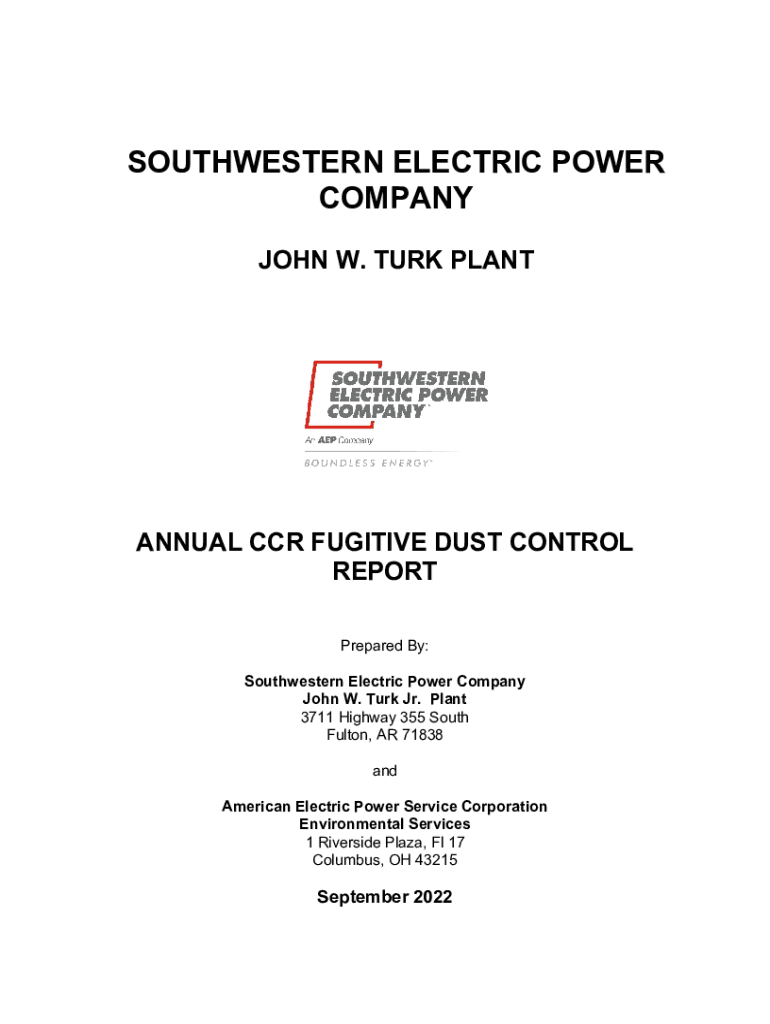 SOUTHWESTERN ELECTRIC POWER COMPANY JOHN W. TURK PLANTANNUAL CCR FUGITIVE DUST CONTROL REPORT Prepared By: Southwestern Electric Power Company John W. Turk Jr. Plant 3711 Highway 355 South Fulton,