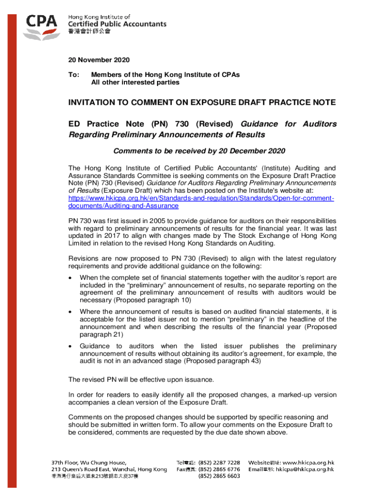 20 November 2020 To:Members of the Hong Kong Institute of CPA's All other interested partiesINVITATION TO COMMENT ON EXPOSURE DRAFT PRACTICE NOTE ED Practice Note (IN) 730 (Revised) Guidance for Auditors