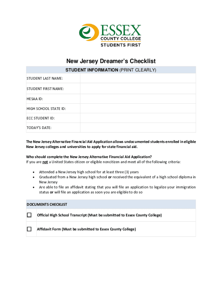 New Jersey Dreamers Checklist STUDENT INFORMATION (PRINT CLEARLY) STUDENT LAST NAME: STUDENT FIRST NAME: ESAA ID: HIGH SCHOOL STATE ID: ECC STUDENT ID: TODAYS DATE: The New Jersey Alternative Financial