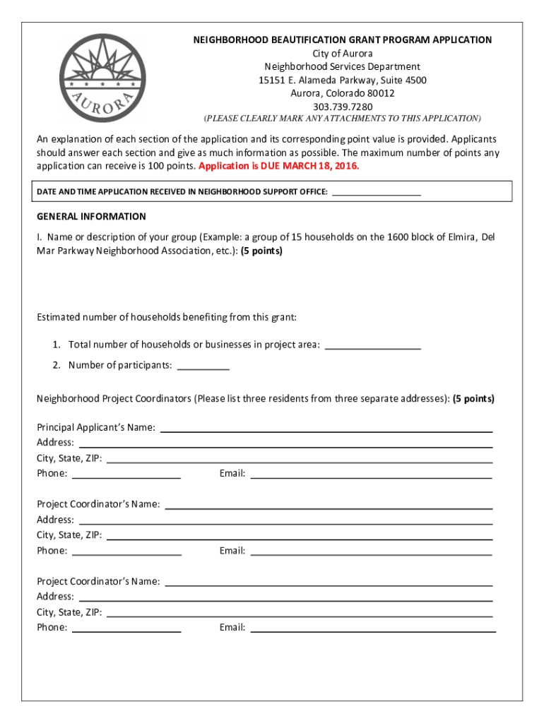 NEIGHBORHOOD BEAUTIFICATION GRANT PROGRAM APPLICATION City of Aurora Neighborhood Services Department 15151 E. Alameda Parkway, Suite 4500 Aurora, Colorado 80012 303.739.7280 (PLEASE CLEARLY MARK