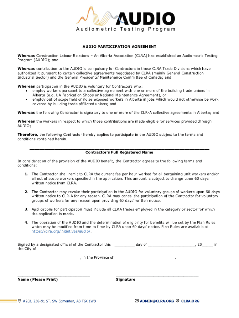 AUDIO PARTICIPATION AGREEMENT Whereas Construction Labor Relations An Alberta Association (CLARA) has established an Audiometric Testing Program (AUDIO); and Whereas contribution to the AUDIO is compulsory