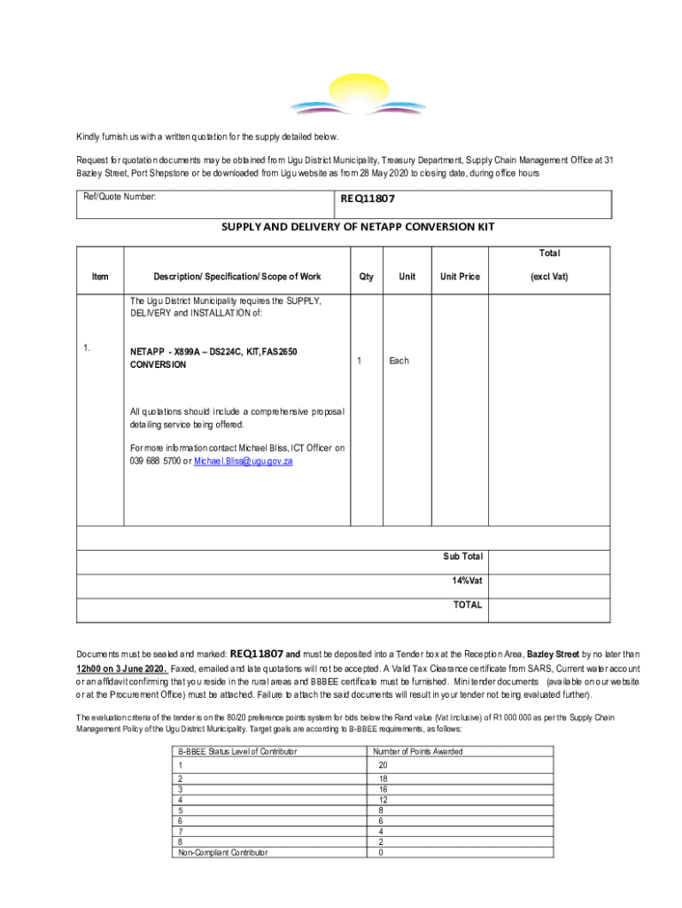 Request for quotation documents may be obtained from UGU District Municipality, Treasury Department, Supply Chain Management