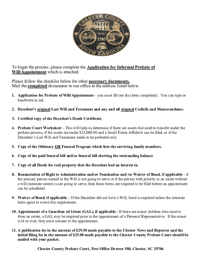 To begin the process, please complete the Application for Informal Probate of Will/Appointment which is attached. Please follow the checklist below for other necessary documents. Mail the completed