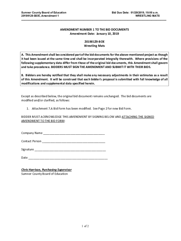 Sumner County Board of Education Bid Due Date: 01/29/2019, 10:00 a.m. 20190129BOE, Amendment 1 WRESTLING MATS ___AMENDMENT NUMBER 1 TO THE BID DOCUMENTS Amendment Date: January 10, 2019 20190129BOE