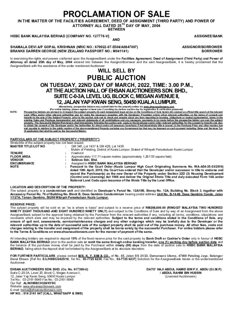 PROCLAMATION OF SALE IN THE MATTER OF THE FACILITIES AGREEMENT, DEED OF ASSIGNMENT (THIRD PARTY) AND POWER OF TH ATTORNEY ALL DATED 25 DAY OF MAY 2004 BETWEEN HSBC BANK MALAYSIA BROAD [COMPANY NO.