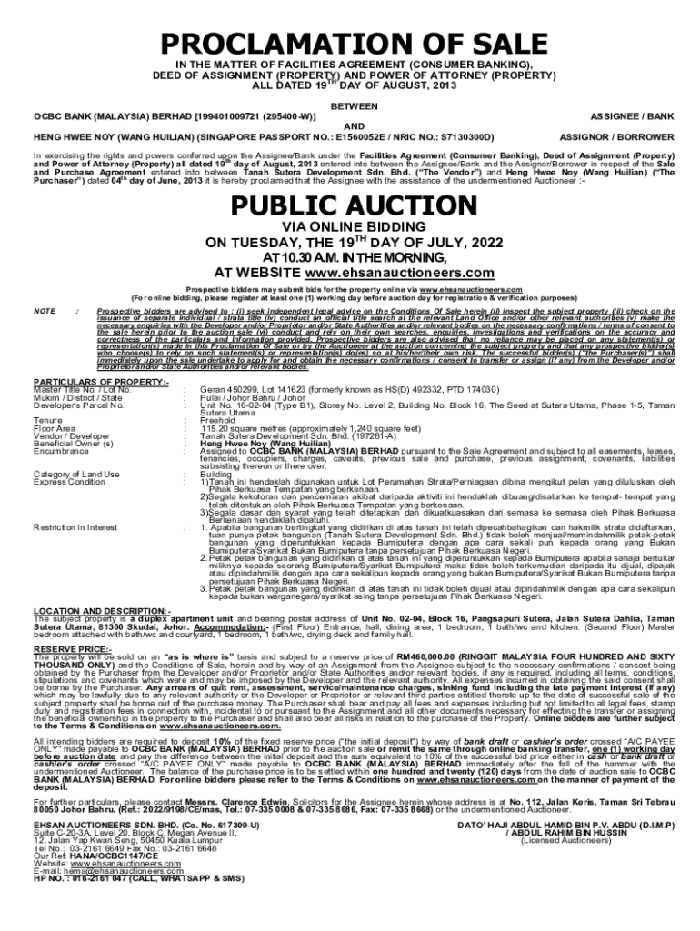 PROCLAMATION OF SALE IN THE MATTER OF FACILITIES AGREEMENT (CONSUMER BANKING), DEED OF ASSIGNMENT (PROPERTY) AND POWER OF ATTORNEY (PROPERTY) TH ALL DATED 19 DAY OF AUGUST 2013 BETWEEN OCBC BANK (MALAYSIA)