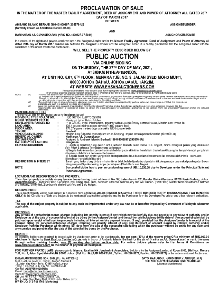 PROCLAMATION OF SALE IN THE MATTER OF THE MASTER FACILITY AGREEMENT, DEED OF ASSIGNMENT AND POWER OF ATTORNEY ALL DATED 28TH DAY OF MARCH 2017 BETWEEN EMBANK ISLAMIC BROAD [199401009897 (295576U)]