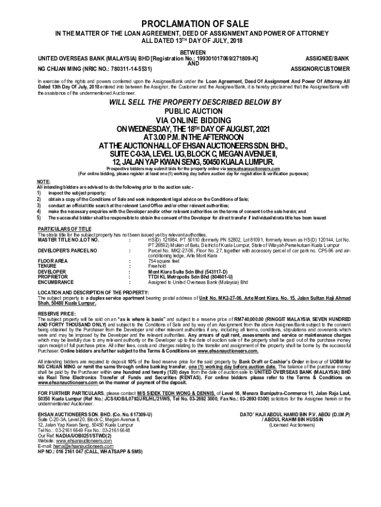 PROCLAMATION OF SALE IN THE MATTER OF THE LOAN AGREEMENT, DEED OF ASSIGNMENT AND POWER OF ATTORNEY ALL DATED 13TH DAY OF JULY 2018 BETWEEN UNITED OVERSEAS BANK (MALAYSIA) BHD [Registration No.: 199301017069/271809K]