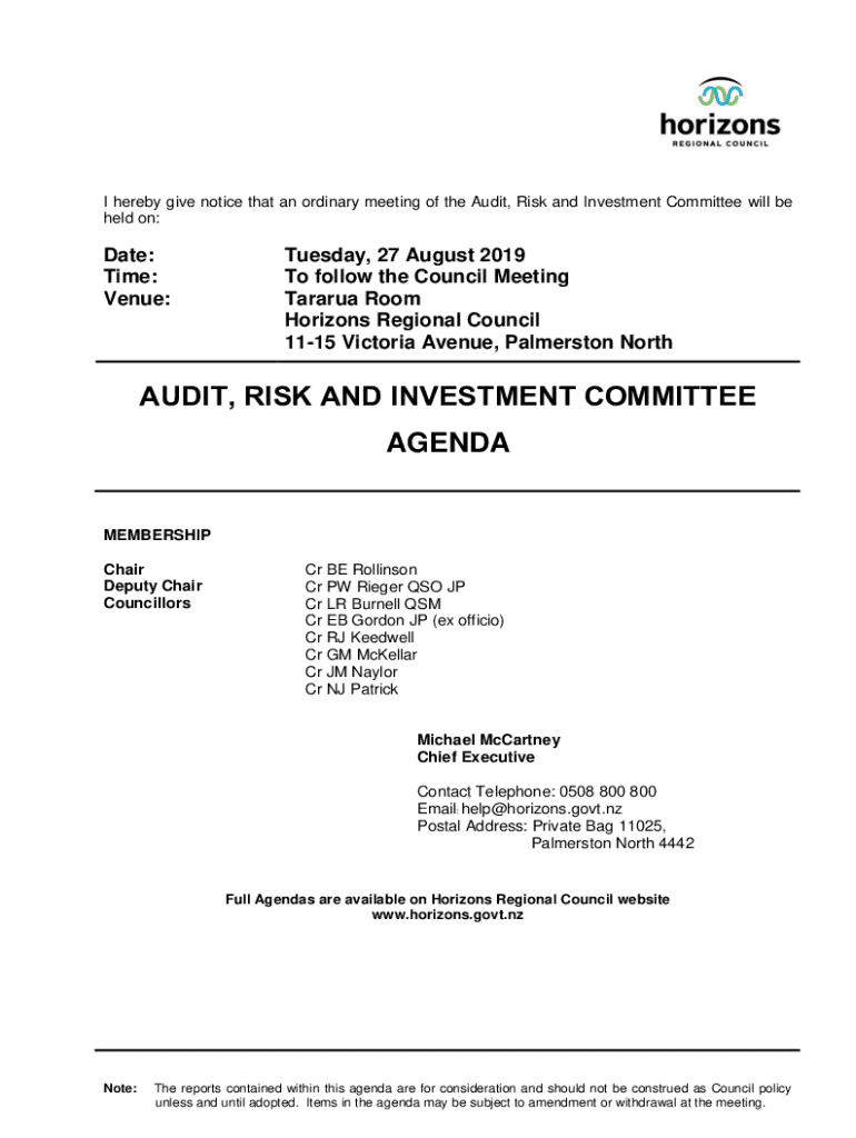 I hereby give notice that an ordinary meeting of the Audit, Risk and Investment Committee will be held on:Date: Time: Venue:Tuesday, 27 August 2019 To follow the Council Meeting Tamara Room Horizons