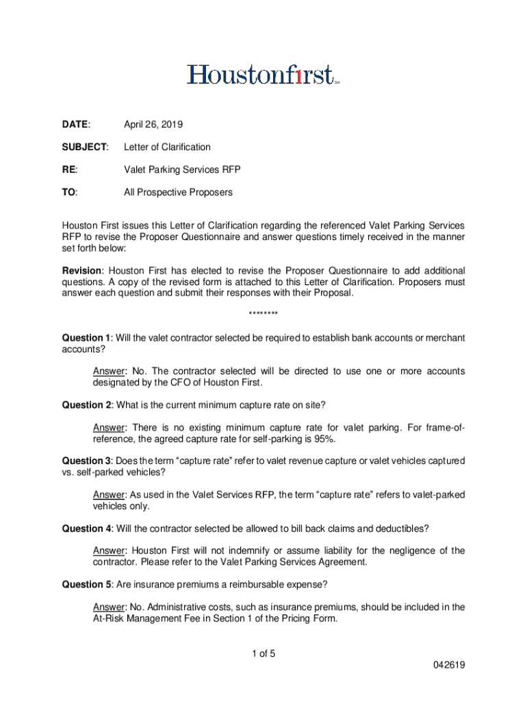 DATE:April 26, 2019SUBJECT:Letter of Clarification RE:Valet Parking Services RF PTO:All Prospective Proposers Houston First issues this Letter of Clarification regarding the referenced Valet Parking