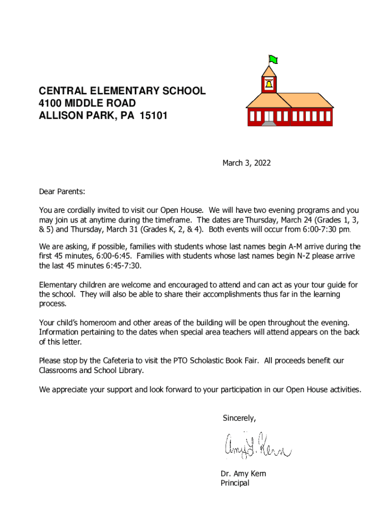 CENTRAL ELEMENTARY SCHOOL 4100 MIDDLE ROAD ALLISON PARK, PA 15101March 3, 2022 Dear Parents: You are cordially invited to visit our Open House. We will have two evening programs, and you may join