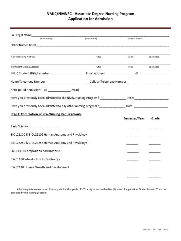 MJC/NM NEC Associate Degree Nursing Program Application for AdmissionFull Legal Name___ (Last Name)(First Name)(Middle Name)Other Names Used ___(Current Mailing Address)(City)(State)(Zip Code)(Permanent