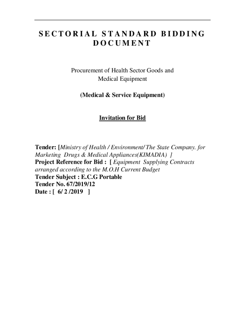 SECTORIAL STANDARD BIDDING DOCUMENTProcurement of Health Sector Goods and Medical Equipment (Medical & Service Equipment)Invitation for Budtender: [Ministry of Health / Environment/ The State Company.