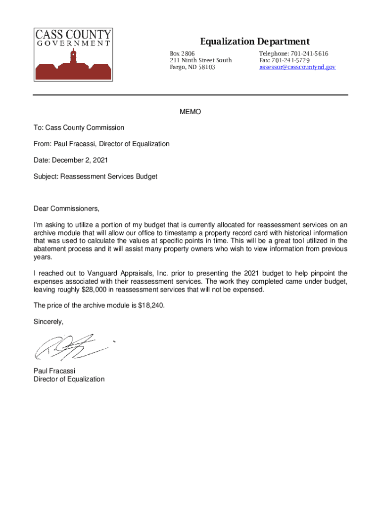 Equalization Department Box 2806 211 Ninth Street South Fargo, ND 58103Telephone: 7012415616 Fax: 7012415729 assessor@casscountynd.govMEMO To: Class County Commission From: Paul Fracas, Director of