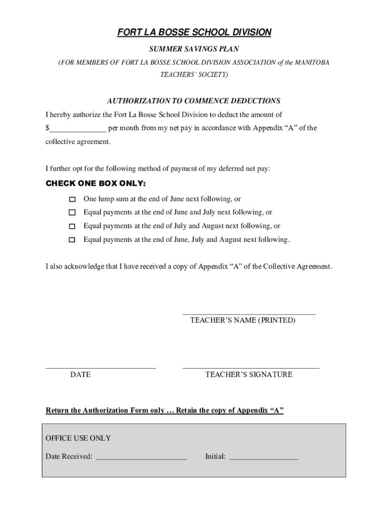 FORT LA BOSS SCHOOL DIVISION SUMMER SAVINGS PLAN (FOR MEMBERS OF FORT LA BOSS SCHOOL DIVISION ASSOCIATION of the MANITOBA TEACHERS SOCIETY)AUTHORIZATION TO COMMENCE DEDUCTIONS I hereby authorize the