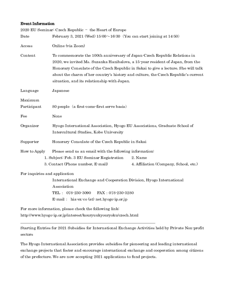 Event Information 2020 EU Seminar: Czech Republic the Heart of Europe Date February 3, 2021 (Wed) 15:0016:30You can start joining at 14:50AccessOnline (via Zoom)Content commemorate the 100th anniversary