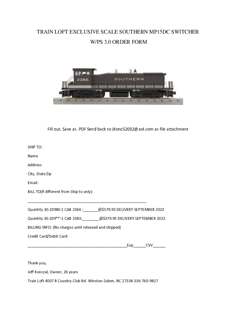 TRAIN LOFT EXCLUSIVE SCALE SOUTHERN MP15DC SWITCHER W/PS 3.0 ORDER Formerly out. Save as .PDF Send back to JKonc52032@aol.com as file attachments TO: Name Address City, State Zip Email: BILL TO(If