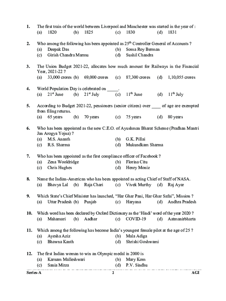 1. The first train of the world between Liverpool and Manchester was started in the year of : (a) 1820 (b) 1825 (c) 1830 (d) 18312. Who among the following has been appointed as 25th Controller General