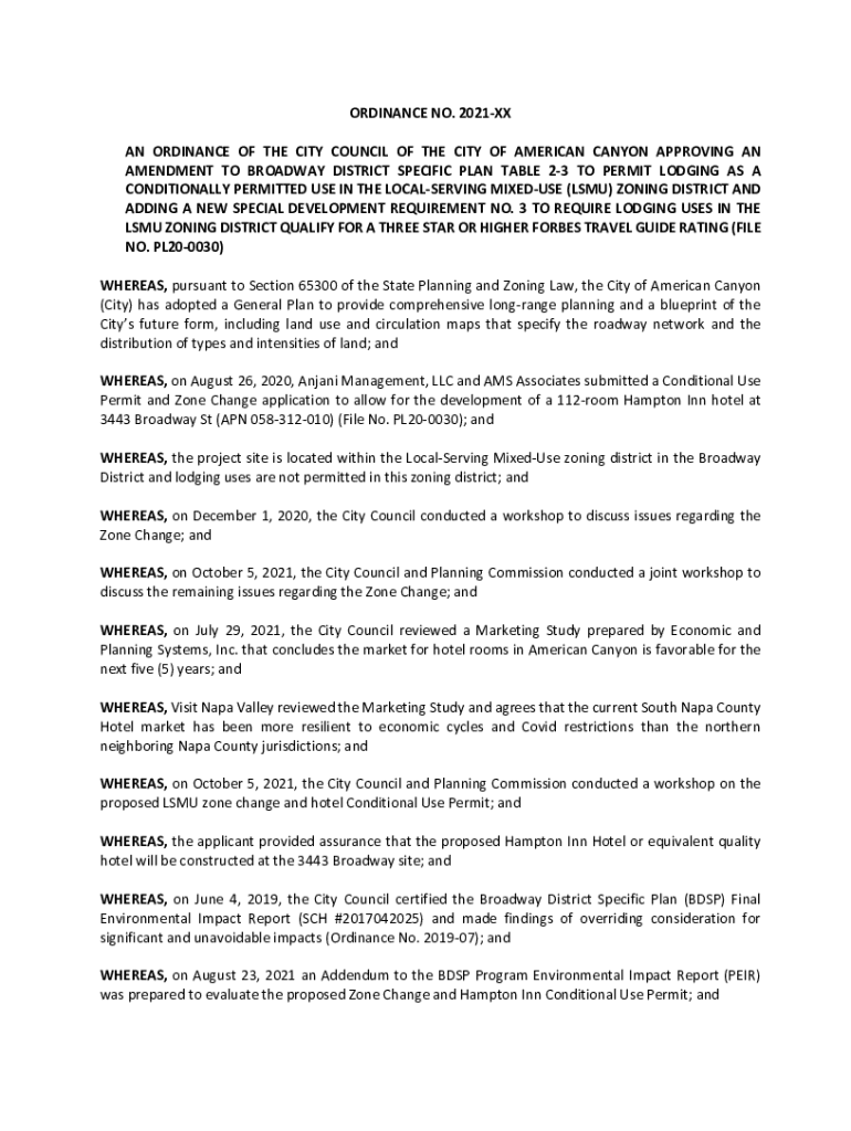ORDINANCE NO. 2021XX AN ORDINANCE OF THE CITY COUNCIL OF THE CITY OF AMERICAN CANYON APPROVING AN AMENDMENT TO BROADWAY DISTRICT SPECIFIC PLAN TABLE 23 TO PERMIT LODGING AS A CONDITIONALLY PERMITTED