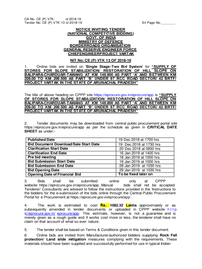 CA No. CE (P) VTOL 201819 Tender No. CE (P) V TK 13 of 201819Srl Page No.___NOTICE INVITING TENDER (NATIONAL COMPETITIVE BIDDING) GOVT. OF INDIA MINISTRY OF Defense BORDERLANDS Organization GENERAL