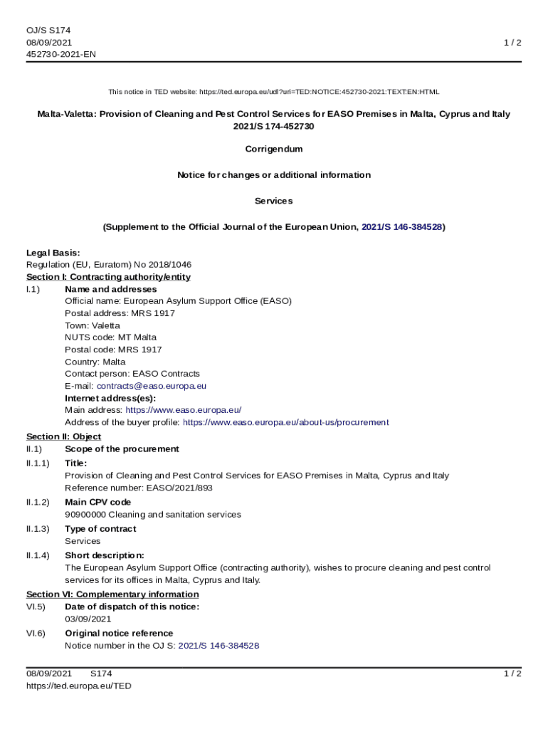 OJ/S S174 08/09/2021 4527302021EN1/2This notice in TED website: https://ted.europa.eu/udl?uriTED:NOTICE:4527302021:TEXT:EN:HTMLMaltaValetta: Provision of Cleaning and Pest Control Services for EASO