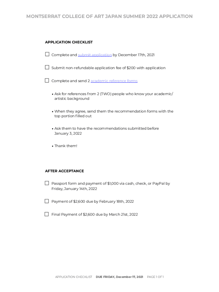 MONTSERRAT COLLEGE OF ART JAPAN SUMMER 2022 APPLICATIONAPPLICATION CHECKLISTComplete and submit application by December 17th, 2021