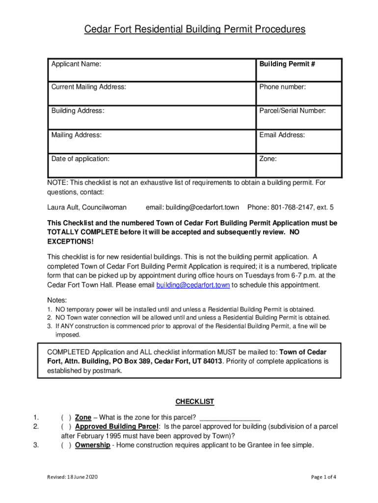 Cedar Fort Residential Building Permit ProceduresApplicant Name:Building Permit #Current Mailing Address:Phone number:Building Address:Parcel/Serial Number:Mailing Address:Email Address:Date of application:Zone:NOTE:
