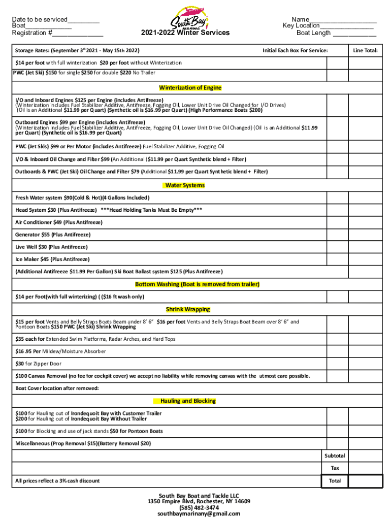 Boat Length ___20212022 Winter ServicesStorage Rates: (September 3rd 2021 May 15th 2022)Initial Each Box For Service:Line Total:$14
