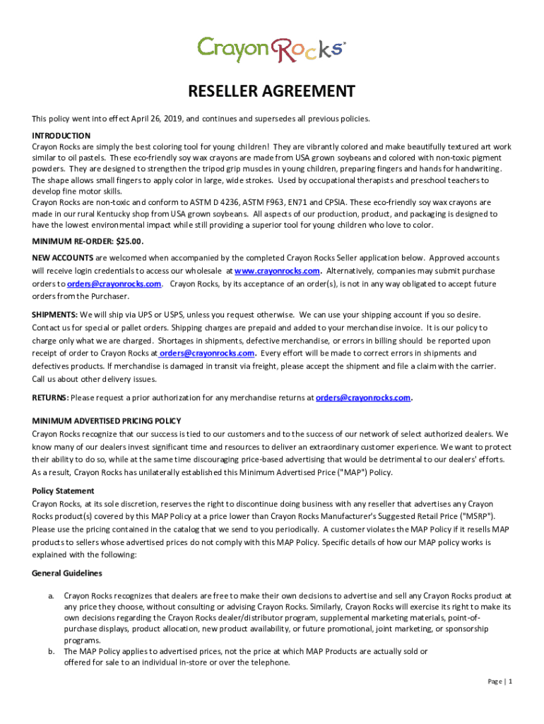RESELLER AGREEMENT This policy went into effect April 26, 2019, and continues and supersedes all previous policies. INTRODUCTION Crayon Rocks are simply the best coloring tool for young children!