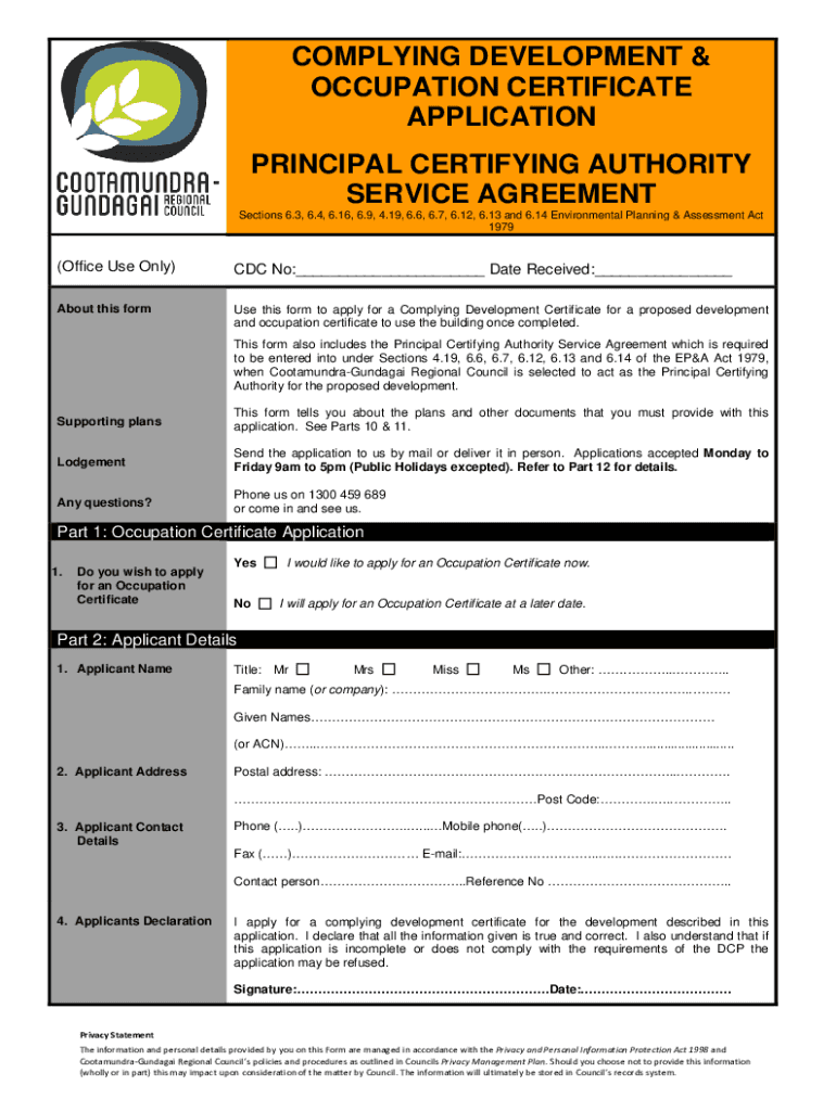 COMPLYING DEVELOPMENT & OCCUPATION CERTIFICATE APPLICATION PRINCIPAL CERTIFYING AUTHORITY SERVICE AGREEMENT Sections 6.3, 6.4, 6.16, 6.9, 4.19, 6.6, 6.7, 6.12, 6.13 and 6.14 Environmental Planning