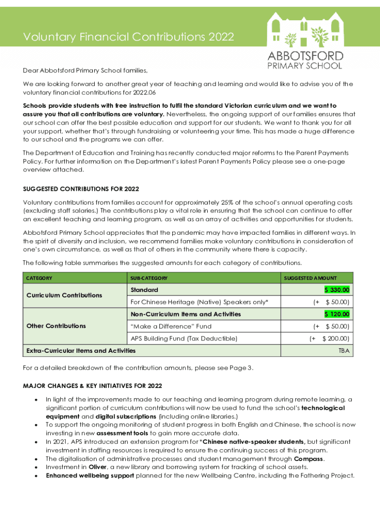 Voluntary Financial Contributions 2022 Dear Abbotsford Primary School families, We are looking forward to another great year of teaching and learning and would like to advise you of the voluntary