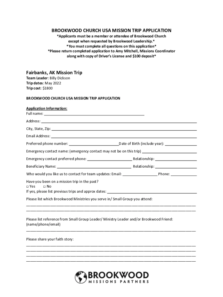 Get the free BROOKWOOD CHURCH USA MISSION TRIP APPLICATION ...
