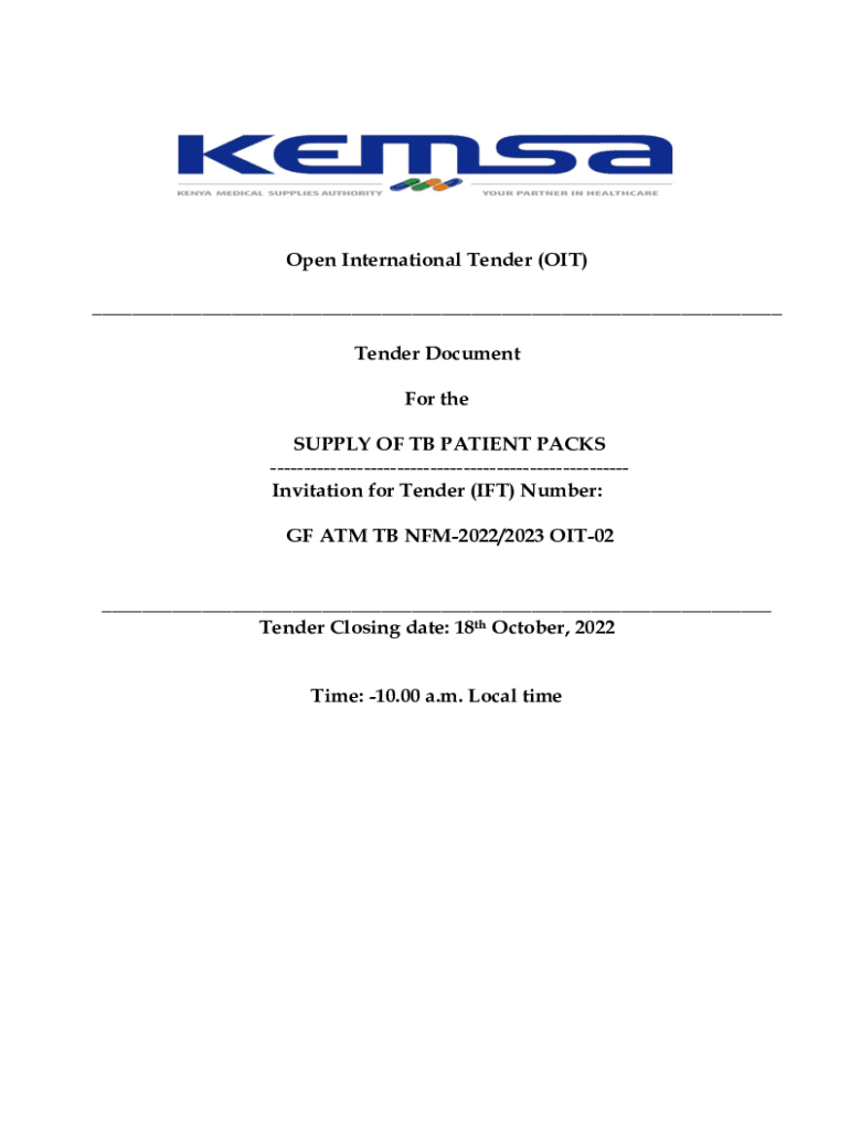 Open International Tender (OIT) ___ Tender Document For the SUPPLY OF TB PATIENT PACKS Invitation for Tender (IT) Number: GF ATM TB NFM2022/2023 OIT02 ___ Tender Closing date: 18th October 2022 Time:
