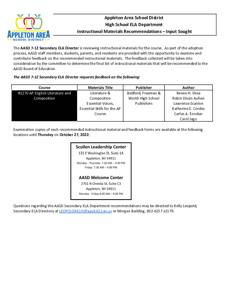 Appleton Area School District High School ELA Department Instructional Materials Recommendations Input Sought The ASD 712 Secondary ELA Director is reviewing instructional materials for the course.