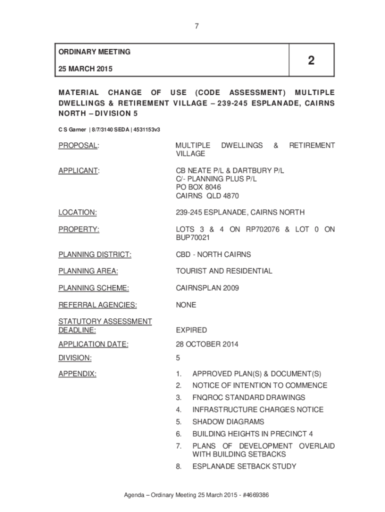 7ORDINARY MEETING225 MARCH 2015MATERIAL CHANGE OF USE (CODE ASSESSMENT) MULTIPLE DWELLINGS & RETIREMENT VILLAGE 239245 ESPLANADE, CAIRNS NORTH DIVISION 5 C S Garner | 8/7/3140 SEA | 4531153v3PROPOSAL:MULTIPLE
