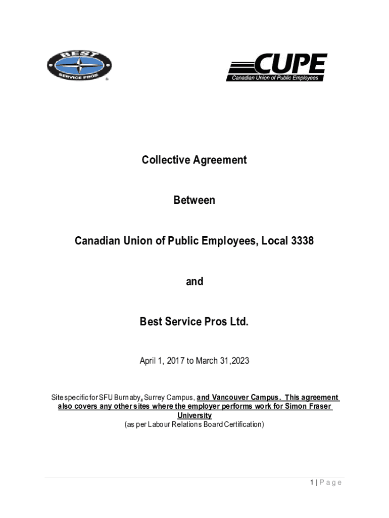 Collective Agreement Between Canadian Union of Public Employees, Local 3338 and Best Service Pros Ltd. April 1, 2017, to March 31,2023Site specific for SFU Burnaby, Surrey Campus, and Vancouver Campus.