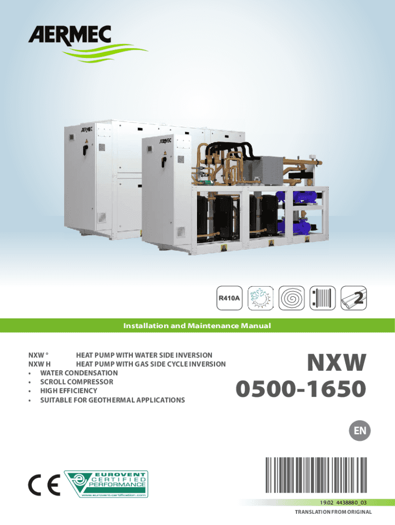 Installation and Maintenance Manual HEAT PUMP WITH WATER SIDE INVERSION NEW HEAT PUMP WITH GAS SIDE CYCLE INVERSION WATER CONDENSATION SCROLL COMPRESSOR HIGH EFFICIENCY SUITABLE FOR GEOTHERMAL APPLICATIONS