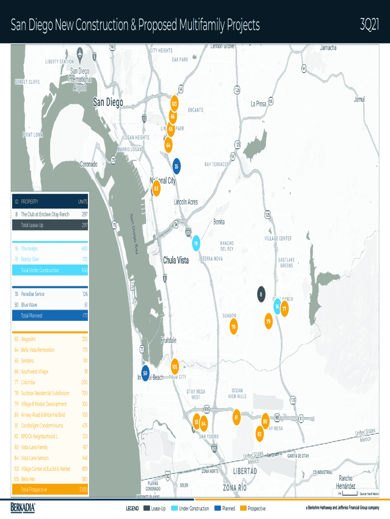 3Q21San Diego New Construction & Proposed Multifamily Projects103 66 65 64 35 63 IDPROPERTY8The Club at Enclave Okay Ranch297Total LeaseUp29716The Avalyn48019Bonita Glen170Total Under Construction65035Paradise