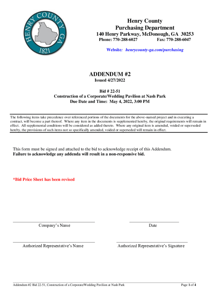 Henry County Purchasing Department 140 Henry Parkway, McDonough, GA 30253 Phone: 7702886027Fax: 7702886047Website: henrycountyga.com/purchasingADDENDUM #2 Issued 4/27/2022 Bid # 2251 Construction