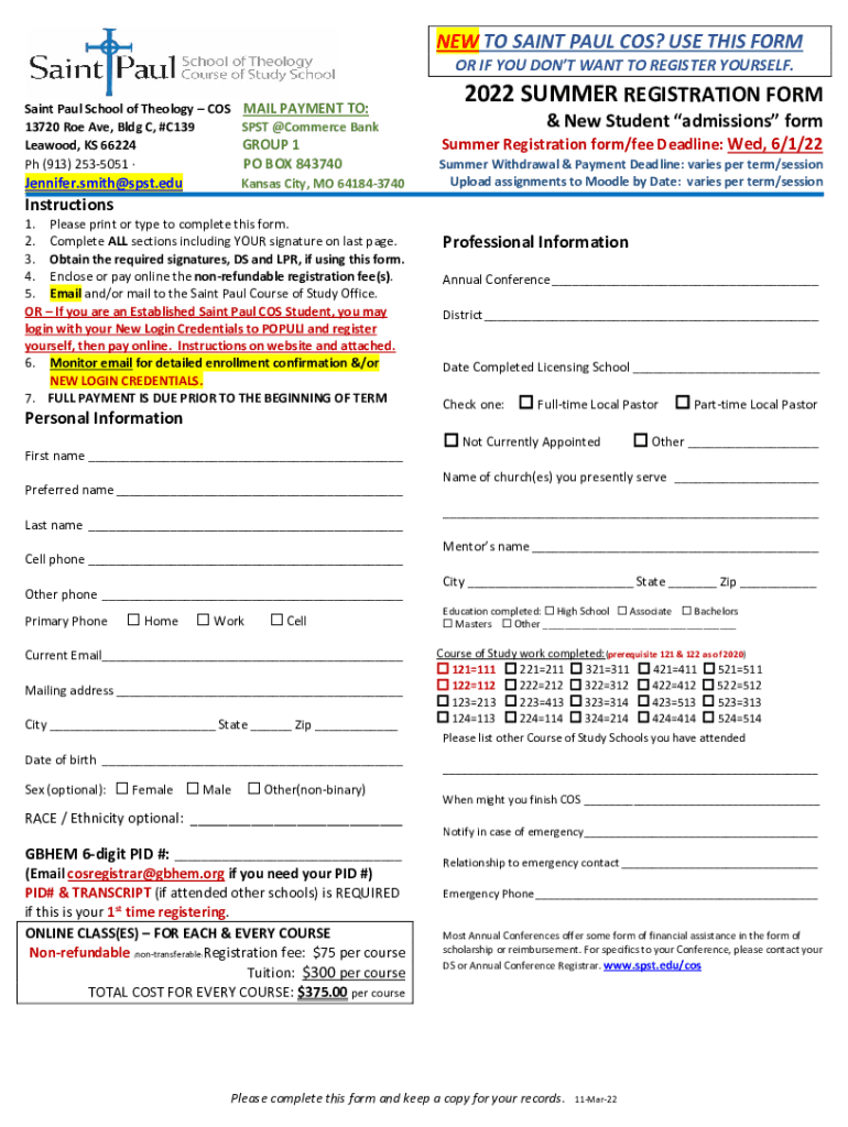 NEW TO SAINT PAUL COS? USE THIS FORM OR IF YOU DON'T WANT TO REGISTER YOURSELF.MAIL PAYMENT TO:Saint Paul School of Theology COS 13720 Roe Ave, Bldg C, #C139 Leawood, KS 66224 pH (913) 2535051 SPOT