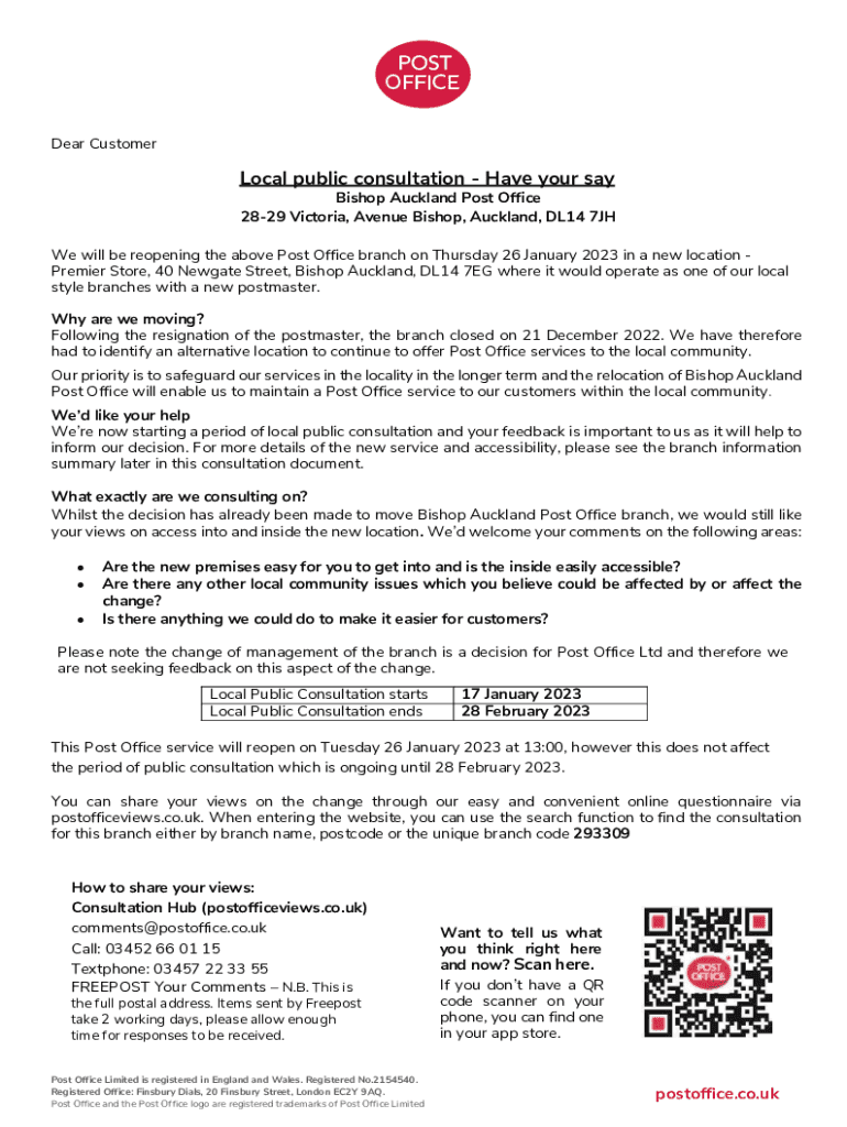 Dear CustomerLocal public consultation Have your say Bishop Auckland Post Office 2829 Victoria, Avenue Bishop, Auckland, DL14 7JHWe will be reopening the above Post Office branch on Thursday 26 January