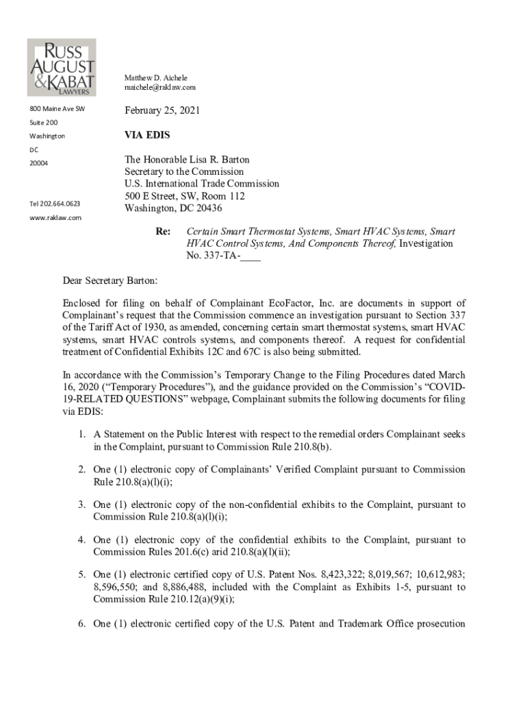! 800 Maine Ave SW Matthew D. Michele maichele@raklaw.comFebruary 25, 2021Suite 200VIA EDISWashington DC 20004Tel 202.664.0623 www.raklaw.comThe Honorable Lisa R. Barton Secretary to the Commission