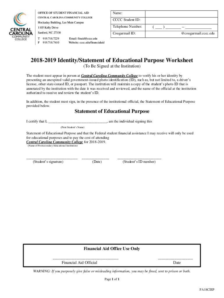 Name:OFFICE OF STUDENT FINANCIAL AID CENTRAL CAROLINA COMMUNITY COLLEGECCCC Student ID:Workaday Building, Lee Main Campus 1105 Kelly DriveTelephone Number:Sanford, NC 27330Cougarmail ID’T F919.718.7229