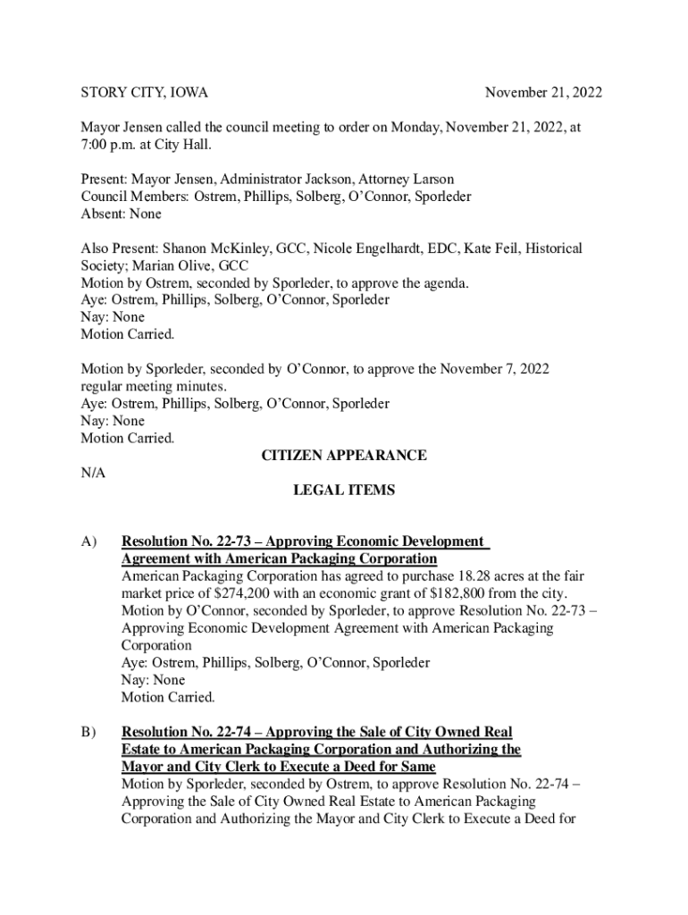 STORY CITY, IOWANovember 21, 2022Mayor Jensen called the council meeting to order on Monday, November 21, 2022, at