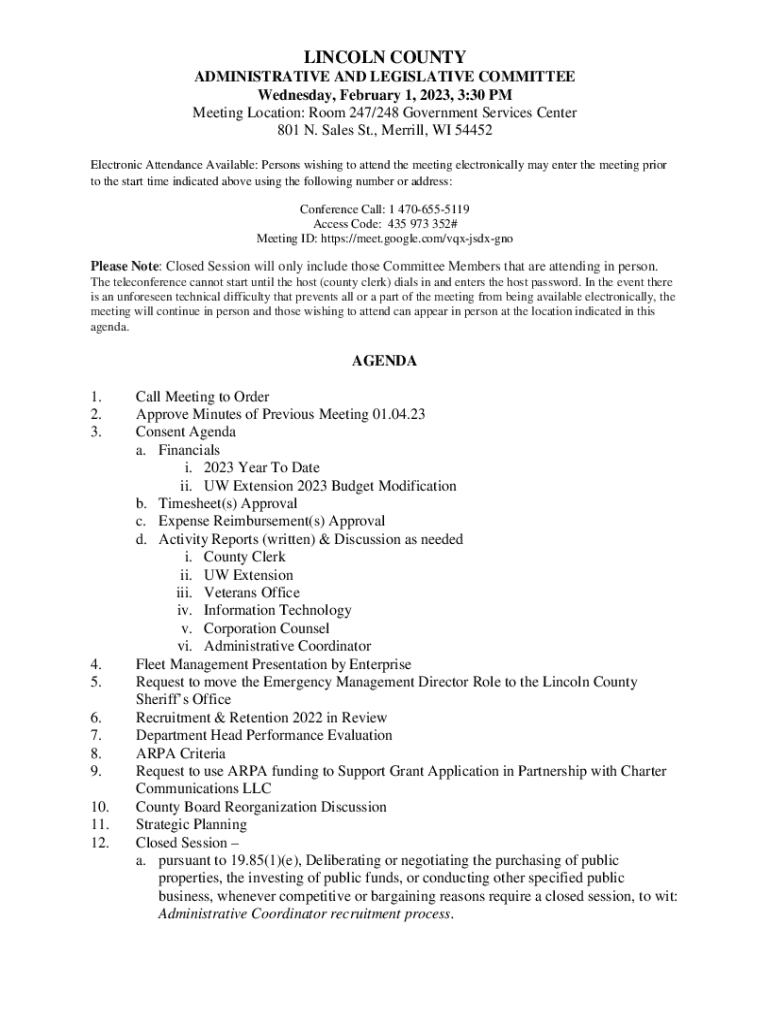LINCOLN COUNTY ADMINISTRATIVE AND LEGISLATIVE COMMITTEE Wednesday, February 1, 2023, 3:30 PM Meeting Location: Room 247/248 Government Services Center 801 N. Sales St., Merrill, WI 54452 Electronic