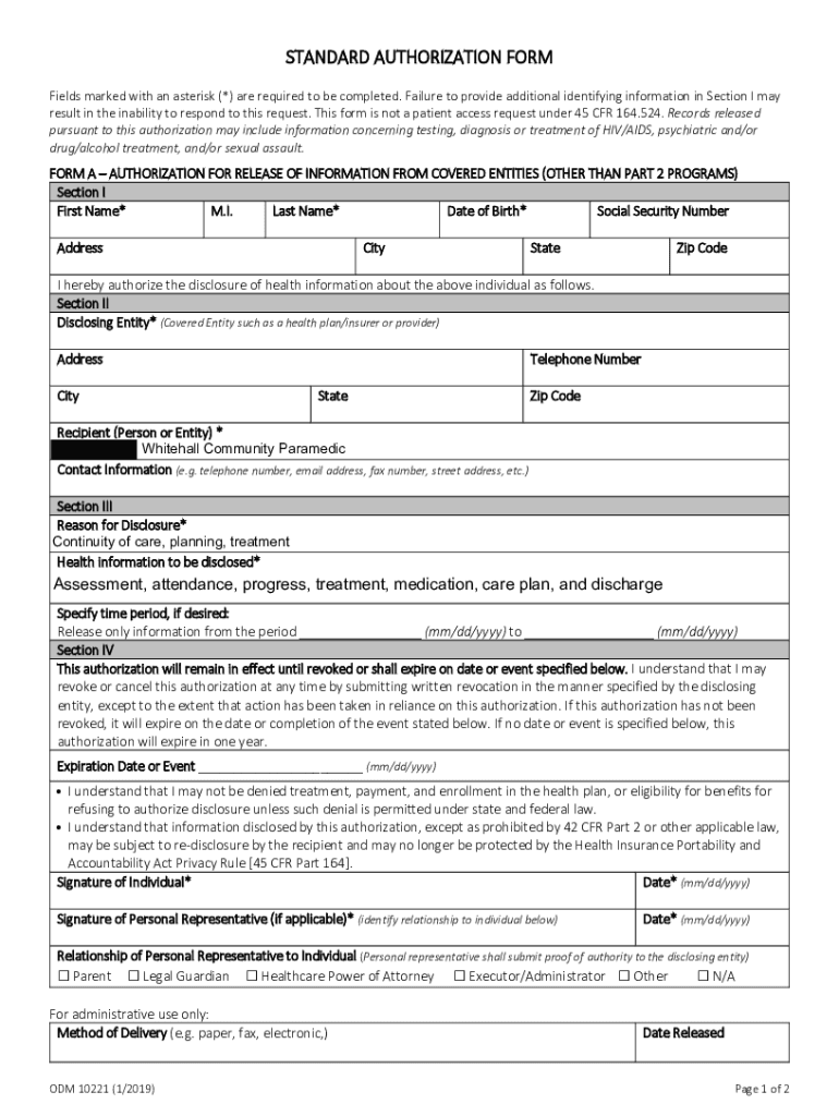 STANDARD AUTHORIZATION FORM Fields marked with an asterisk (*) are required to be completed. Failure to provide additional identifying information in Section I may result in the inability to respond