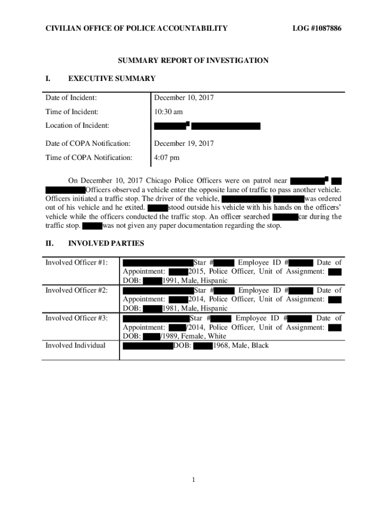 CIVILIAN OFFICE OF POLICE ACCOUNTABILITY #1087886SUMMARY REPORT OF INVESTIGATION I.EXECUTIVE SUMMARYDate of Incident:December 10, 2017Time of Incident:10:30 allocation of Incident: Date of COPY Notification:December