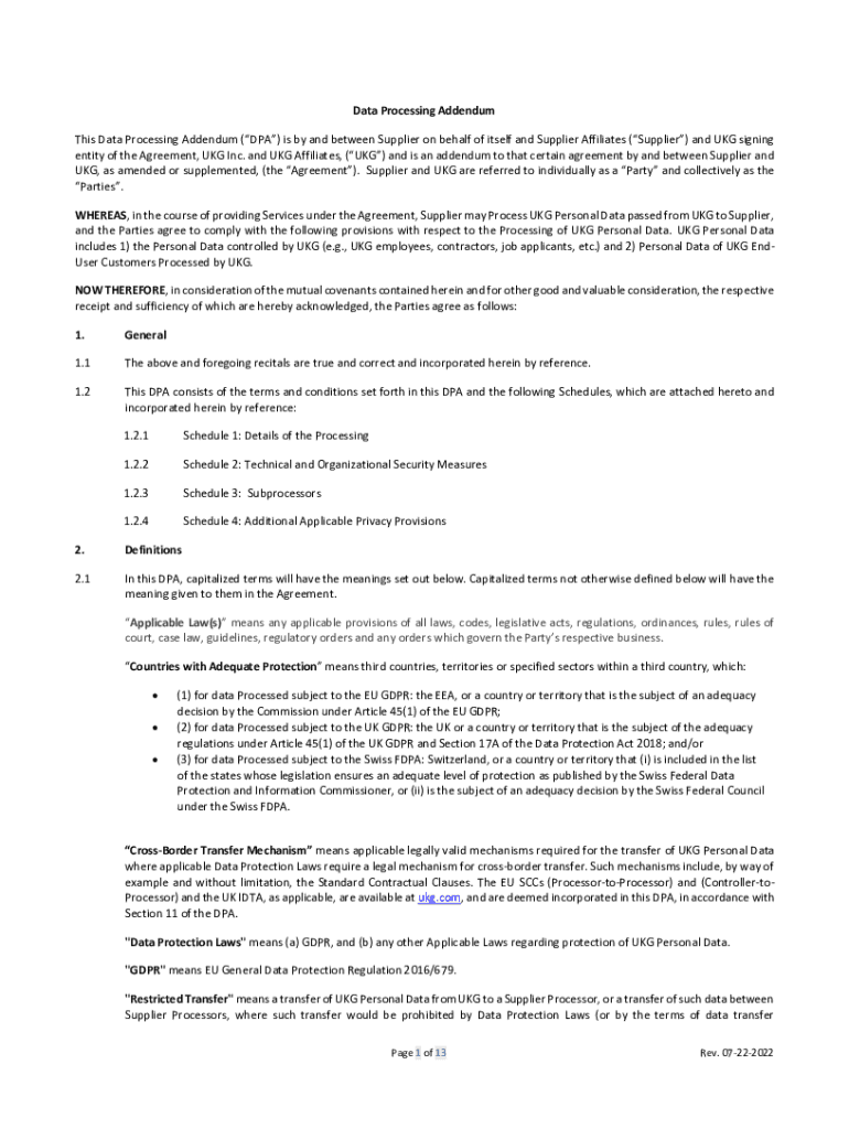 Data Processing Addendum This Data Processing Addendum (DPA) is by and between Supplier on behalf of itself and Supplier Affiliates (Supplier) and UK signing entity of the Agreement, UK Inc. and UK